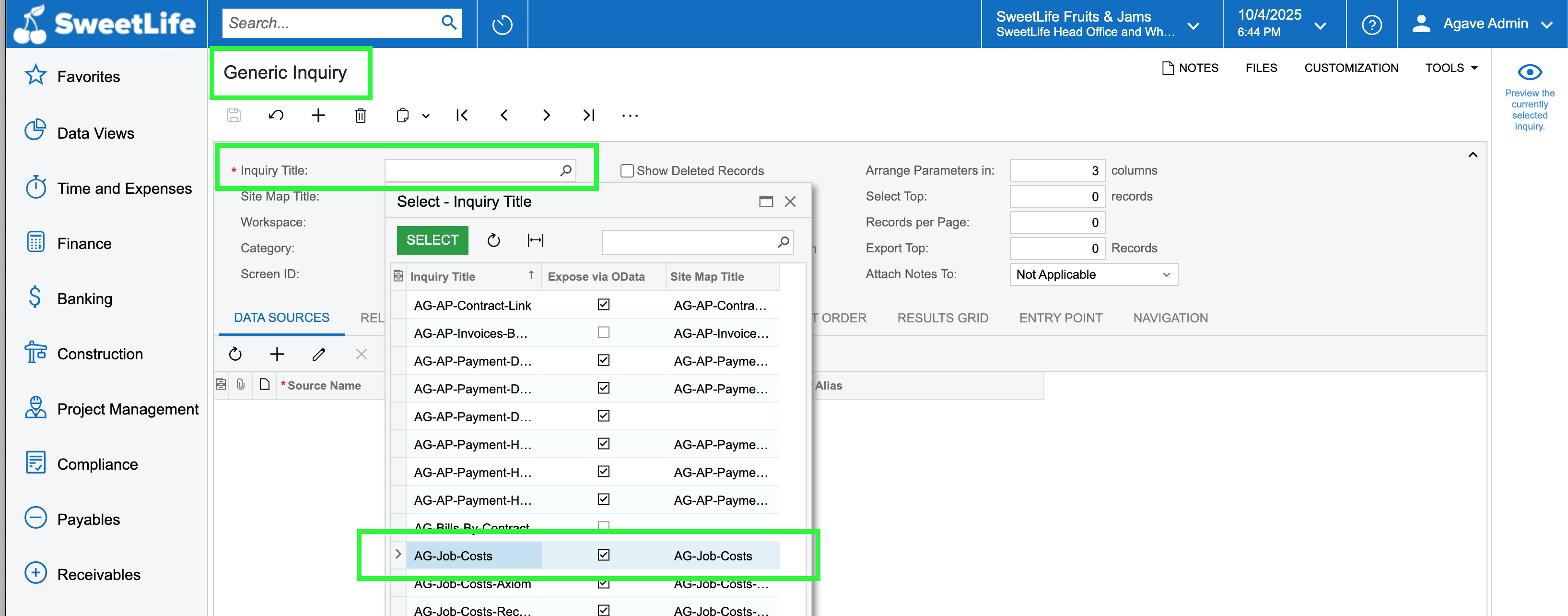 After installing the customization, you need to update several generic inquiries to ensure that Agave can retrieve project-specific data correctly.