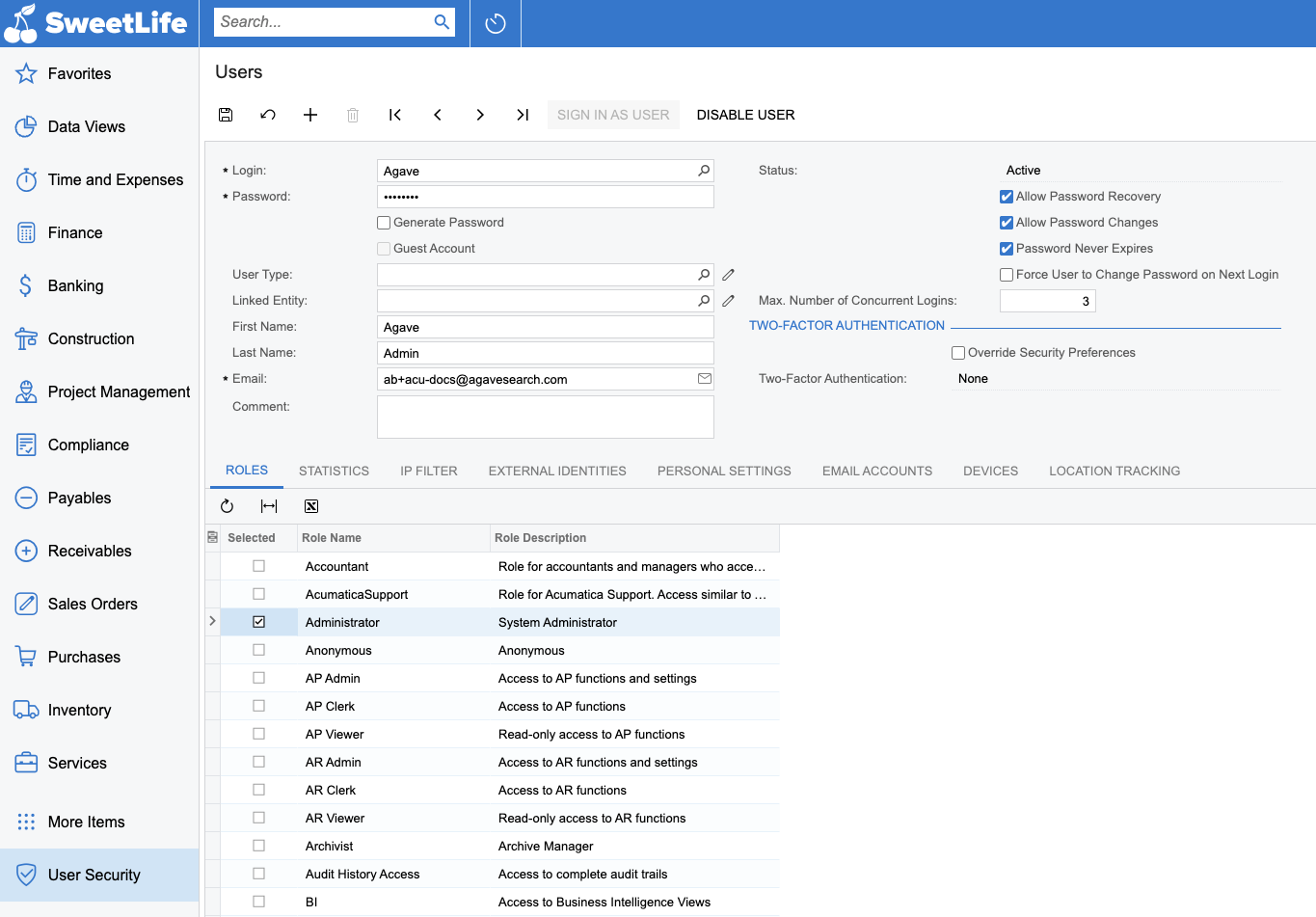 Note: The Administrator role grants unrestricted access to all forms, data, and configuration settings in Acumatica. Only assign this role to trusted Agave personnel who require it for integration setup and troubleshooting.